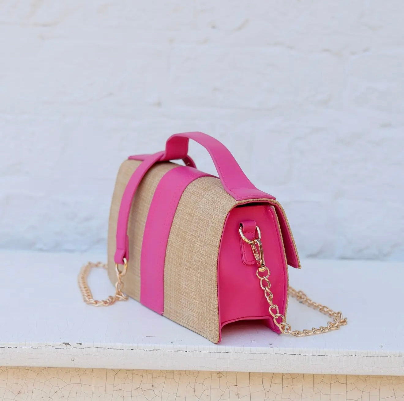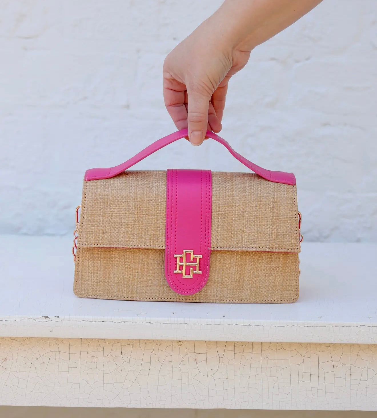 Chic, polished, and effortlessly versatile — the Waverly Clutch in Natural & Hot Pink is the statement accessory your wardrobe needs. Featuring a textured natural body with a bold hot pink accent and gold hardware, this bag instantly elevates any look. Carry it by the structured top handle for a refined feel, or attach the chain strap to wear it crossbody for hands-free ease. From brunch dates to evening events, this piece transitions seamlessly wherever you go.