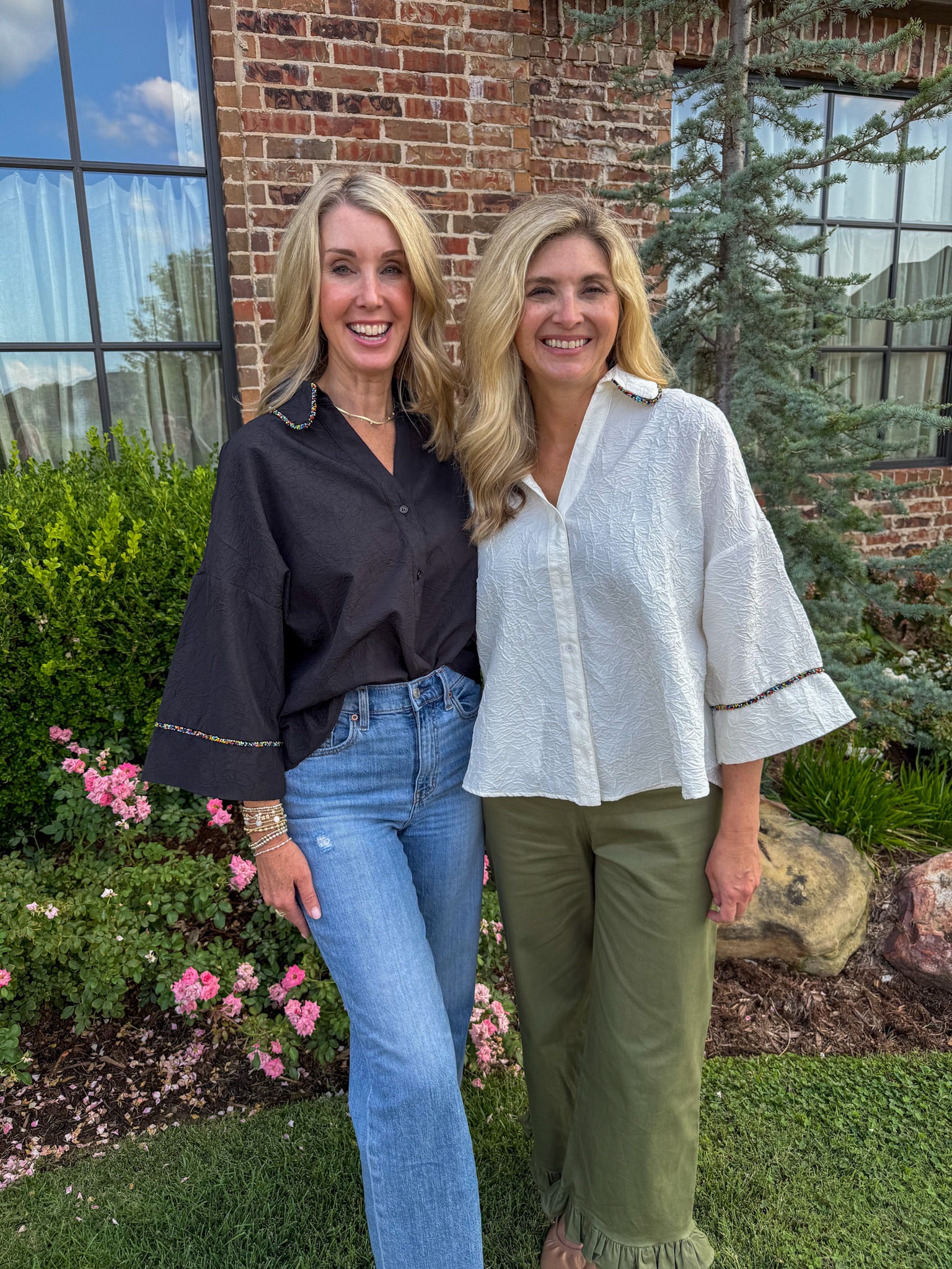 Elevate your everyday style with the Beaded Horizon Top, available in classic black or crisp cream. This relaxed, button-front blouse features a subtly textured fabric and wide, cropped sleeves for effortless movement. Delicate, multicolor beaded trim along the collar and sleeve cuffs adds a playful pop of artistry, making it the perfect blend of minimalism and charm.