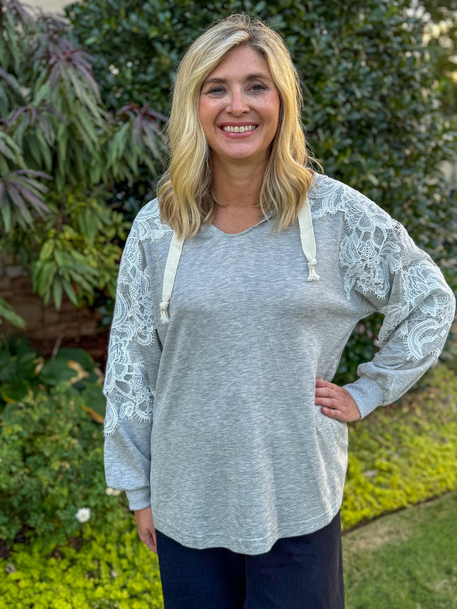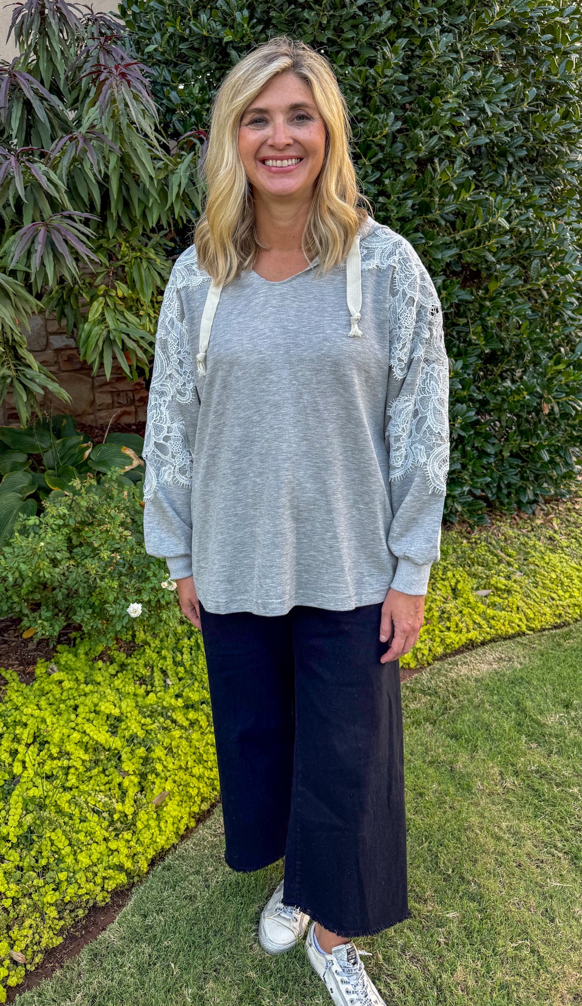 Meet your new off duty favorite: the Lace & Leisure Hoodie. This soft and effortlessly chic pullover blends relaxed comfort with feminine charm. Featuring delicate lace detailing on voluminous balloon sleeves, dropped shoulders, and ribbed cuffs, it's the perfect balance of laid-back and luxe. Made from a cozy, stretchy blend of rayon, polyester, and spandex, it drapes beautifully for that just-right oversized fit.