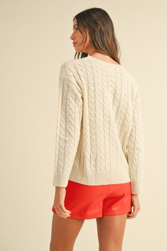 Add a playful pop of holiday cheer with this cozy cable knit sweater featuring three embroidered pink Christmas trees topped with golden stars. The textured cable pattern brings a classic winter feel, while the hand-drawn–inspired embroidery gives it a whimsical, artisanal touch. Designed with a crew neckline and a regular fit, this soft acrylic knit keeps you warm and stylish for all your festive moments.